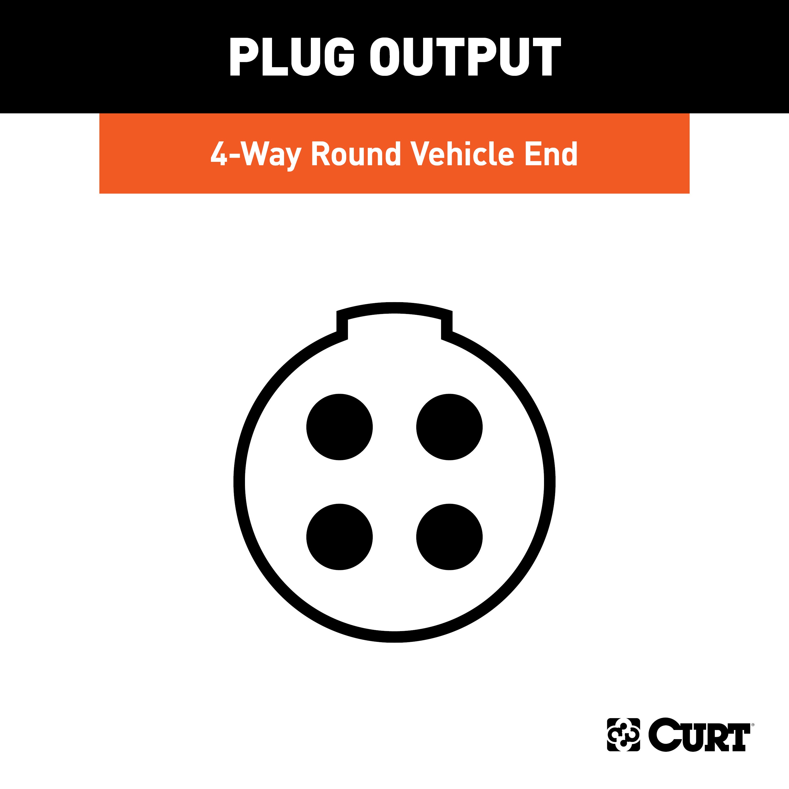 Like trailer hitches and ball mounts, electrical connectors range all over the board in shape, size and capability, but no matter what your trailer's electrical functions are, you need a solid connection to keep the power flowing and ensure safety on the road. CURT electrical connectors are designed and manufactured to give you a reliable connection every time you plug in your trailer. This 4-way round connector is designed to supply power for tail lights, turn signals and brake lights, as well as a ground connection. It features durable die-cast metal construction and has concealed terminals and a spring-loaded steel cover to resist damage from dust and water. This 4-way round connector is a female-end socket, specifically designed for the vehicle side of the connection.