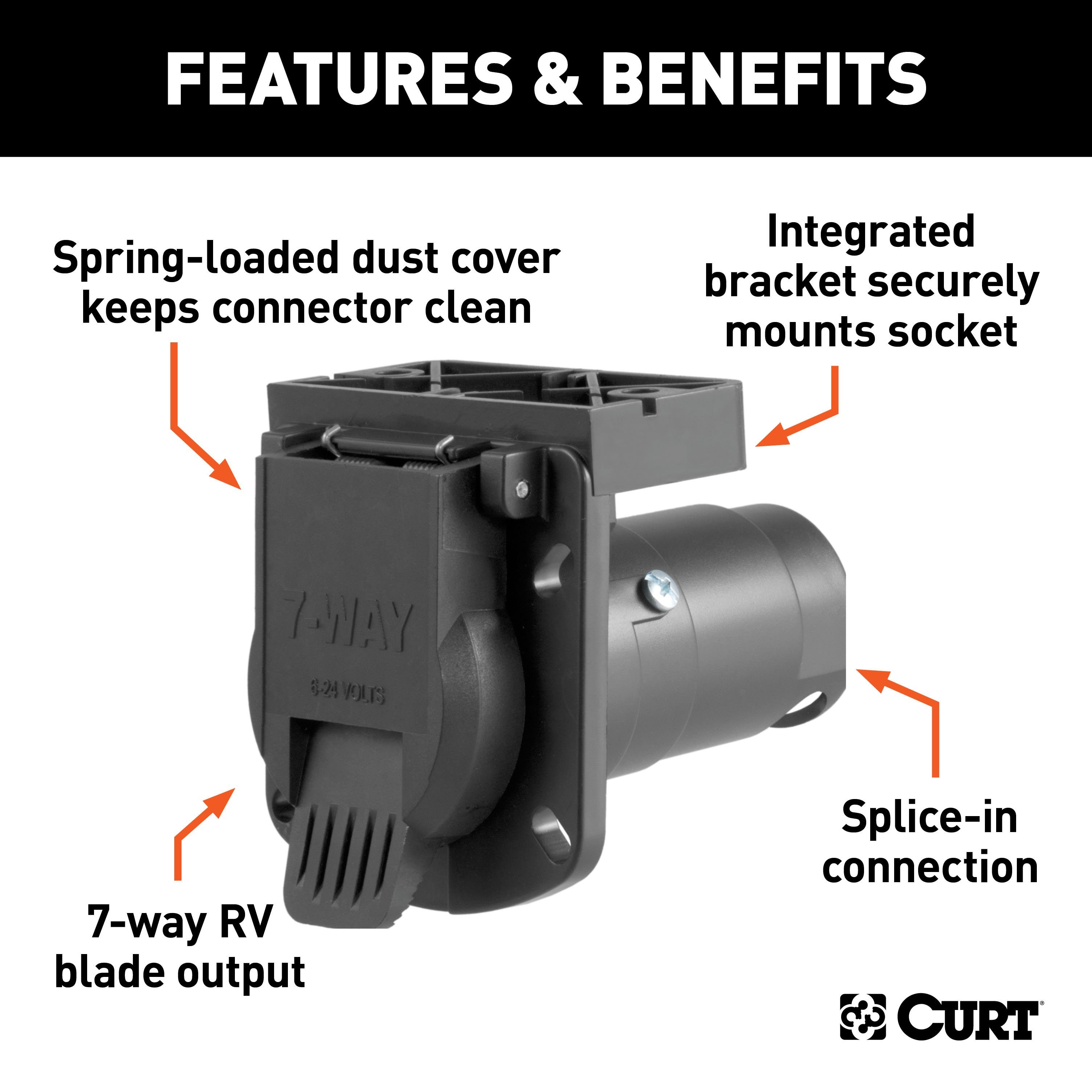 Like trailer hitches and ball mounts, electrical connectors range all over the board in shape, size and capability, but no matter what your trailer's electrical functions are, you need a solid connection to keep the power flowing and ensure safety on the road. CURT electrical connectors are designed and manufactured to give you a reliable connection every time you plug in your trailer. This 7-way round RV blade connector is designed to supply power for tail lights, turn signals, electric trailer brakes, a 12-volt battery, reverse lights and brake lights, as well as a ground connection. It features rust-free black plastic construction and comes with a spring-loaded cover to keep out dust and water. This 7-way round connector is a female-end socket, specifically designed for the vehicle side of the connection. 7-way RV blades are typically used on RV travel trailers, and this particular connector can be easily interchanges with other 7-way RV connectors.