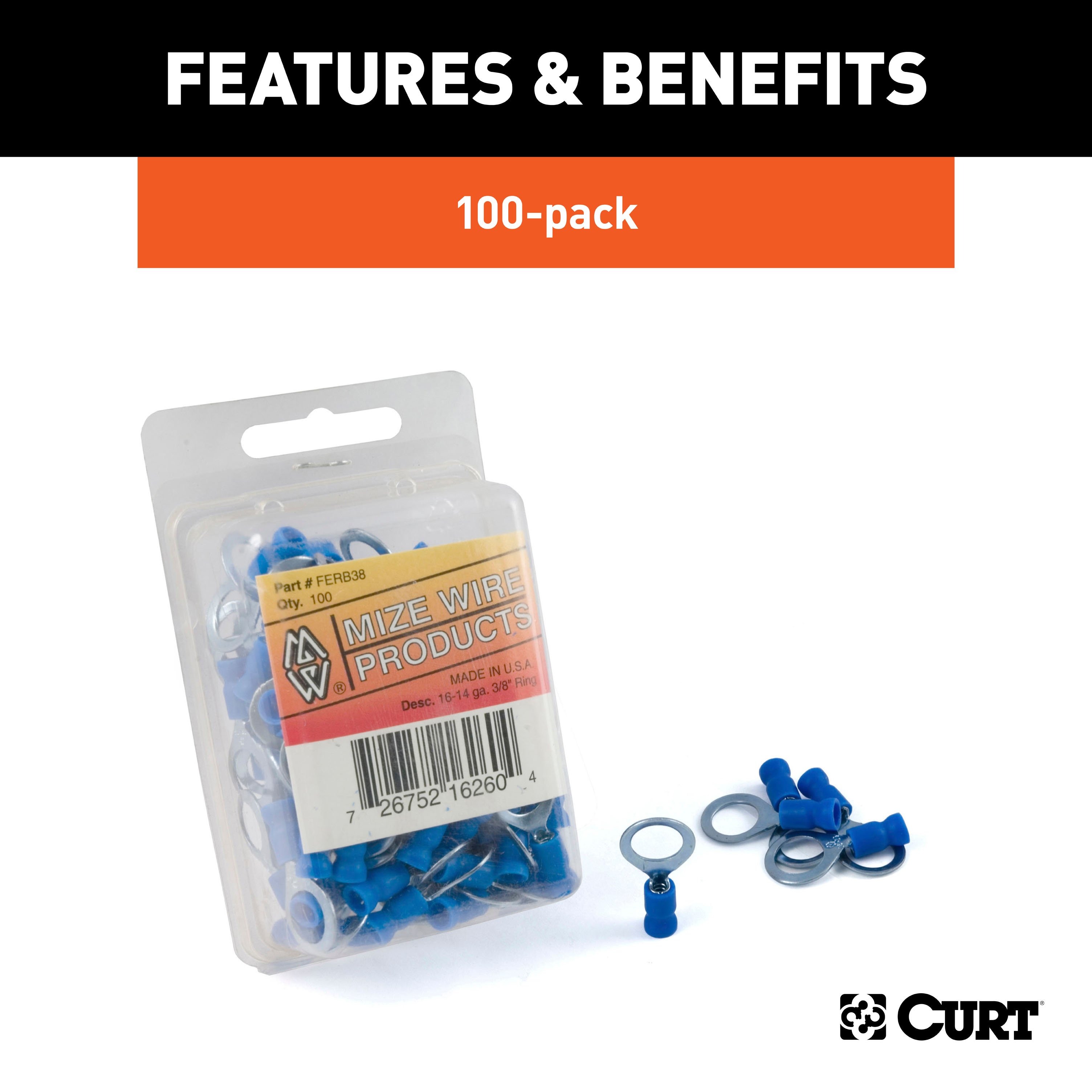 Even down to the simplest components, CURT is always looking for ways to improve your towing experience. CURT wire terminals are vinyl-insulated and available in a range of sizes to fit different gauges of wiring and different size bolts. Ring terminals are preferred for their fixed design, screwing into place and requiring the fastener to be completely unscrewed for removal. These ring terminals are color-coded and designed to fit 16-14 gauge wire and a 3/8" stud. This package includes 100 terminals. CURT terminals can be used for all sorts of wiring and rewiring projects on your trailer or tow vehicle. Terminals may be specifically called for during the installation of certain electrical devices, but in general, they can be used for any number of electrical connection applications using the appropriate size screw or bolt. They offer a more secure mount and a better connection than a bare wire alone. One of the most common ways an electrical terminal is used is in making a ground connection for a connector or other electrical component.