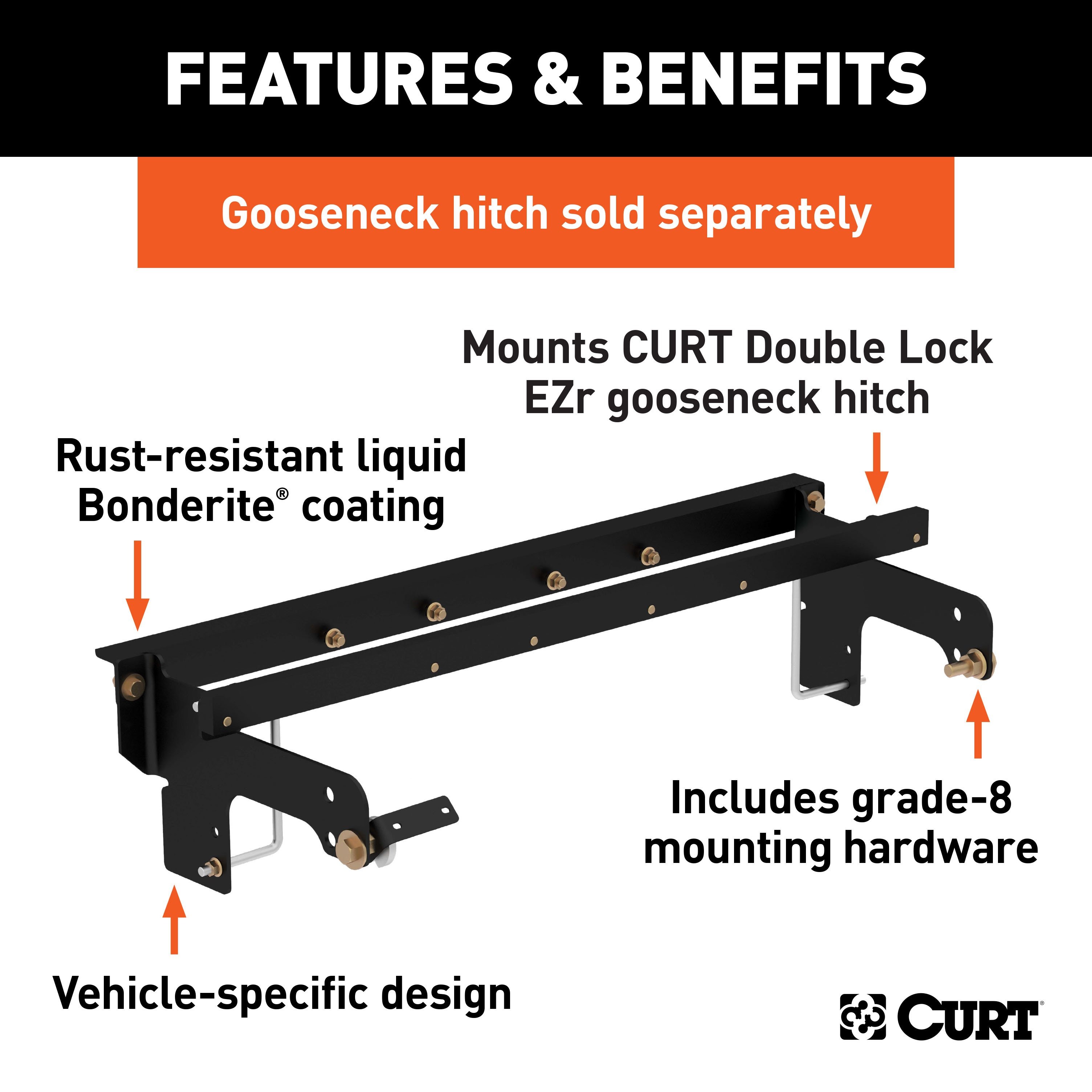 They've made the truck said to turn the world under its tires and the trailer that moves mountains in a day. But what about the hitch powerful enough to connect the two? The CURT under-bed Double Lock EZr gooseneck hitch features a gross trailer weight capacity up to 30,000 lbs., a vertical load limit of 7,500 lbs. and easier, more secure towing for your gooseneck trailer. Providing a solid foundation for the Double Lock EZr, this set of gooseneck installation brackets is designed for a vehicle-specific fit to maximize your pickup's towing potential and integrate with the frame seamlessly. Installation with the CURT Double Lock EZr is fast and easy. Because the installation brackets are made vehicle-specific, they use pre-existing holes in the vehicle's frame and require less drilling. The Double Lock EZr requires only one person during installation, using retainer clips to keep bolts secure and the center section fully supported while mounting it into place. It also uses carriage bolts whenever possible for one-wrench tightening and does not require the exhaust to be lowered during installation. This particular set of gooseneck installation brackets is specifically designed to mount the CURT Double Lock EZr gooseneck hitch #60619 on certain years of the Chevy Silverado and GMC Sierra 2500HD or 3500 (see application info to verify fitment). It features a laser-cut construction for a precise fit and is rated to the vehicle's maximum gross trailer weight capacity. With each gooseneck installation bracket sub kit, we provide the necessary hardware for an easier installation, and we coat our gooseneck brackets in a liquid A-coat to make sure rust and other potential threats are not a problem.
