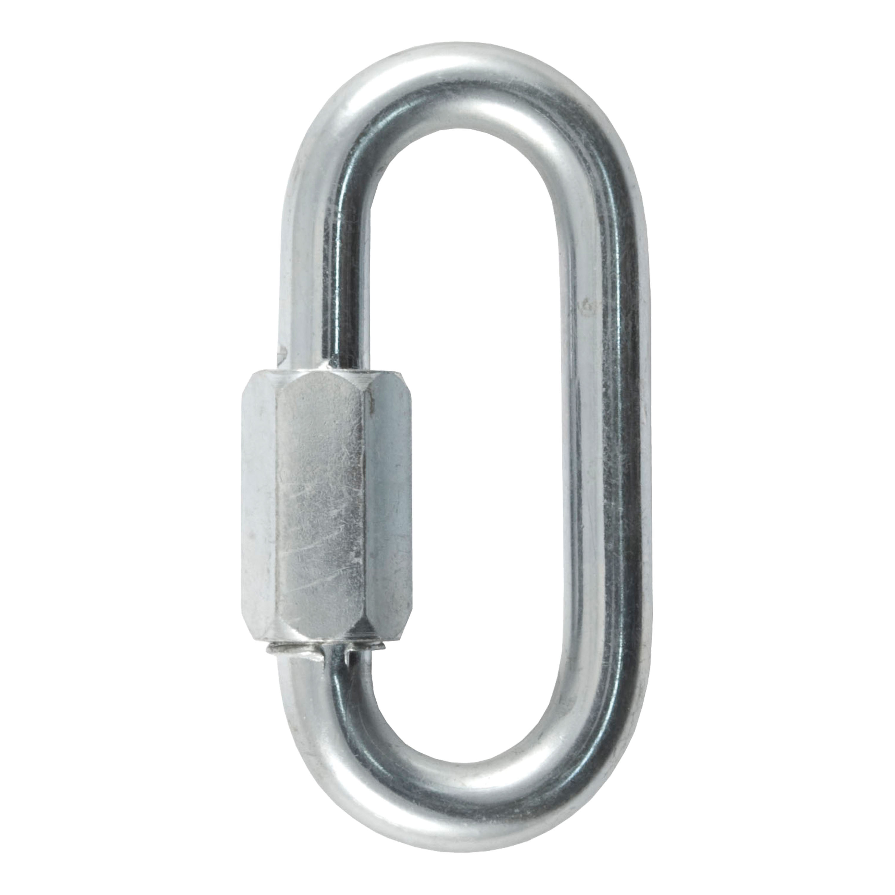 CURT quick links are an extremely versatile and reliable tool to help you get to your destination and go a little further once you get there. A quick link is essentially a hook that is able to be fastened into a closed loop. This means it can be linked onto any D-ring or tie-down like a hook and just as easily secured like a seamless link in a chain. CURT quick links feature a special threaded end and barrel screw that allow them to be dependable and convenient. The threaded link requires no tools for tightening or loosening, though it does feature a hex shape that can accept a wrench for an extra tight hold. Quick link hooks can be used to connect rope, cable and chain, and they are the perfect safety accessory to maximize the security of your safety chains and trailer. Their list of possible applications also goes well beyond towing, giving you a reliable connection for rock climbing, boating, camping, setting up a swing or hammock, leashing the dog, repairing chain, fastening down cargo and more. To make sure our quick links are fit to face the outdoors and all of your undertakings, we construct them from heat-treated steel and give them a zinc-plated finish for durability and rust resistance. This CURT quick link features a breaking strength of 11,000 lbs., a working load limit of 2,200 lbs. and features a 3/8" diameter link.