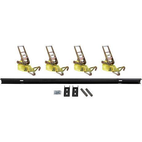 The kit includes a steel or stainless-steel latch bar kit that must be custom fit to the truck along with four heavy duty ratchet tie-down straps.