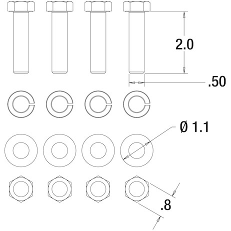 Mounting Kit: (4) 1/2 in. x 2 in. Grade 8 cap screws, (4) 1/2 in. Grade 8 hex nuts, and (4) 1/2 in. heavy lock washers