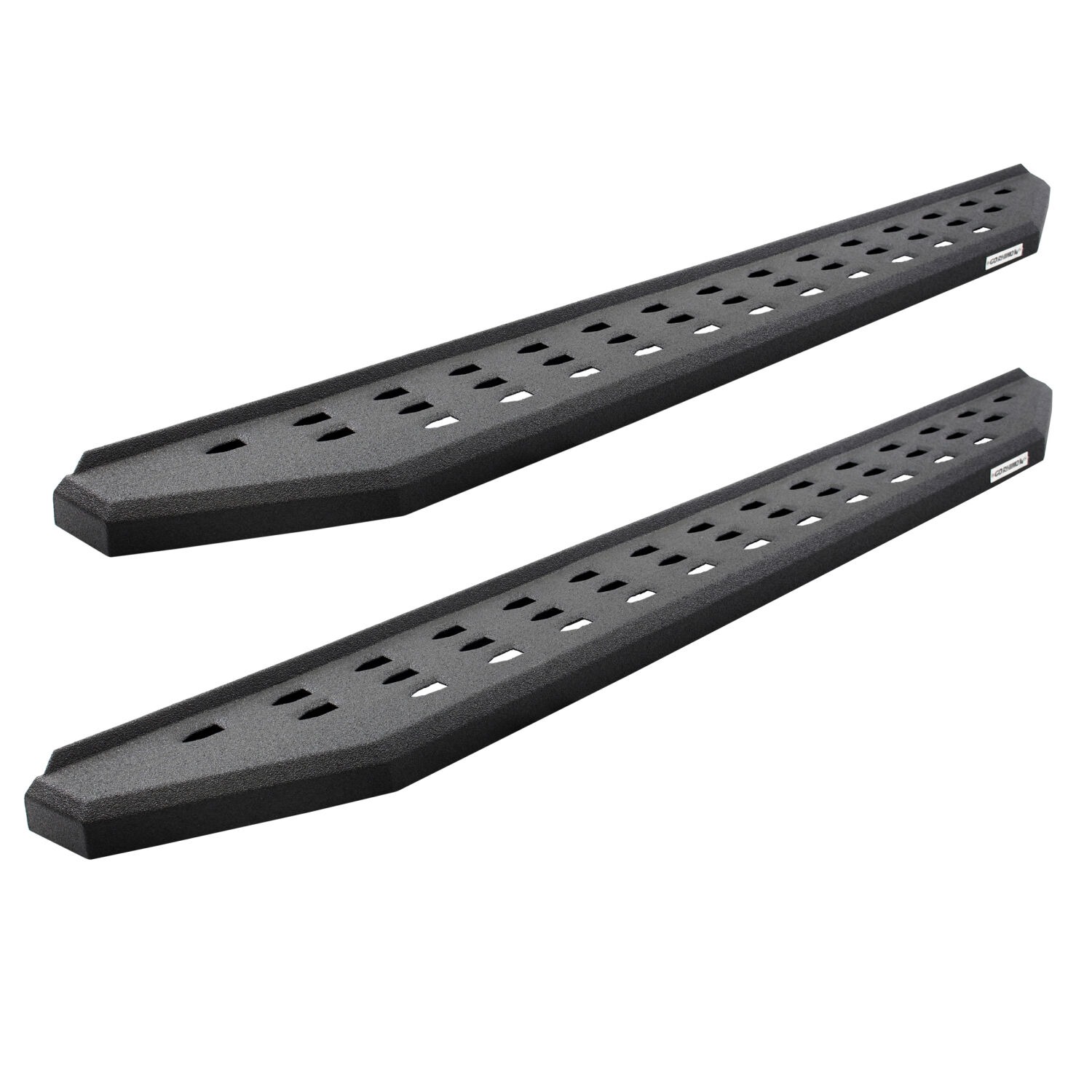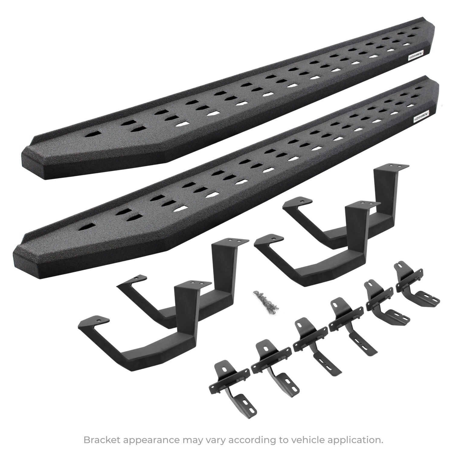 Go Rhino's legendary RB20 cab length running boards will make your truck, Jeep or SUV stand apart from the crowd. With an aggressive, yet stylish appearance, these bolt-on steps take their visual inspiration from the Ford Raptor but are made for more than just looks. The RB20's perforated holes, punched into the surface of the step, gives maximum traction and prevents mud, ice, and snow from accumulating. The corrosion-resistant 16-gauge steel steps are mounted high and tight, giving them plenty of clearance for off-roading, and are strong enough to support hundreds of pounds. The RB20 is offered in textured black powder coat or bedliner coating. Matching drop steps will make entering and exiting lifted vehicles even easier. Hardware and brackets are included. RB20 Running Boards With Drop Steps come with a Limited Lifetime warranty on materials and construction and a 5 year warranty on the Bedliner finish.