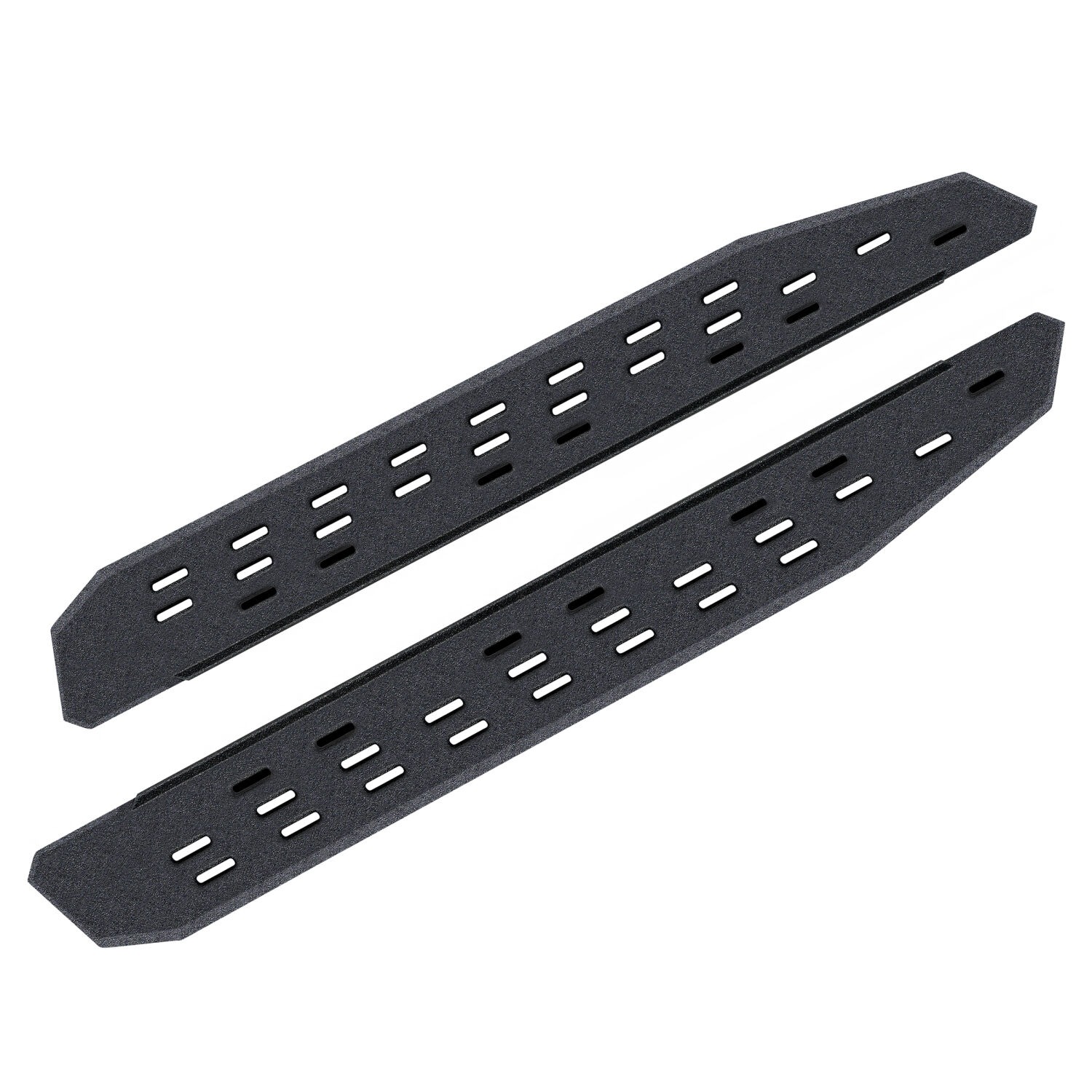 Meet the third edition of the legendary Go Rhino RB Series of running boards: the RB30. The RB30 is the next generation of Raptor-inspired design that will make your truck, Jeep, Bronco or SUV stand out from the crowd. With its aggressive, stylish appearance, this cab-length, bolt-on side step provides maximum traction and features an open flow-through design that prevents mud, ice, and snow from accumulating. The corrosion-resistant 16-gauge steel step mounts tightly to factory mounting points along the lower rocker panel, providing plenty of clearance for off-roading, and it’s strong enough to support 300 lbs. per stepping surface for 600 lbs. per board. The RB30 Running Board is 7” wide for most its length before it tapers. All RB Series Running Boards are available in Textured Black Powder Coat or Protective Bedliner finish, made in North America and offer a limited lifetime warranty against manufacturer and material defects, with a 5-year warranty on the finish.