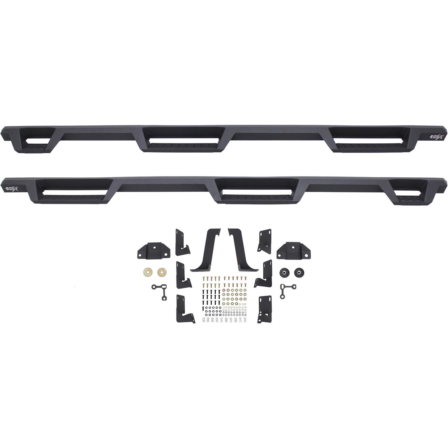 Westins HDX Drop Wheel-to-Wheel Nerf Step Bars feature a notched bar design with a 3rd step location for easy bed access. They provide strong traction with over 2 inches more of toe/heel step area than our Westin's HDX Drop W2W Nerf Step Bars include an added 3rd step location for easier bed area and cargo access. HDX also boasts more than 2 inches of added toe/heel step area which far exceeds all other competitive brands. HDX's notched bar design construction results in a reliable long lasting Bar, with a solid fit and a rugged look. The added length of HDX Drop Wheel-to-wheel Nerf Step Bars provides users with better cab access and better footing and traction for both drivers and passengers. Product includes mount kit and is offered in a variety of vehicle specific applications. Bolt-on installation so no drilling required. Mount kit included. Westin's exclusive Isolator Bracket supports the step bar past the truck cab, a feature that competitors do not offer. Without an Isolator Bracket, the step area that extends past the vehicle is left unsupported. Our unique design provides extra bed support without resulting in annoying creaking sounds.